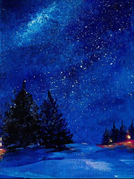 Under the Endless Sky – Framed Winter Night Oil Painting (30×25 cm)