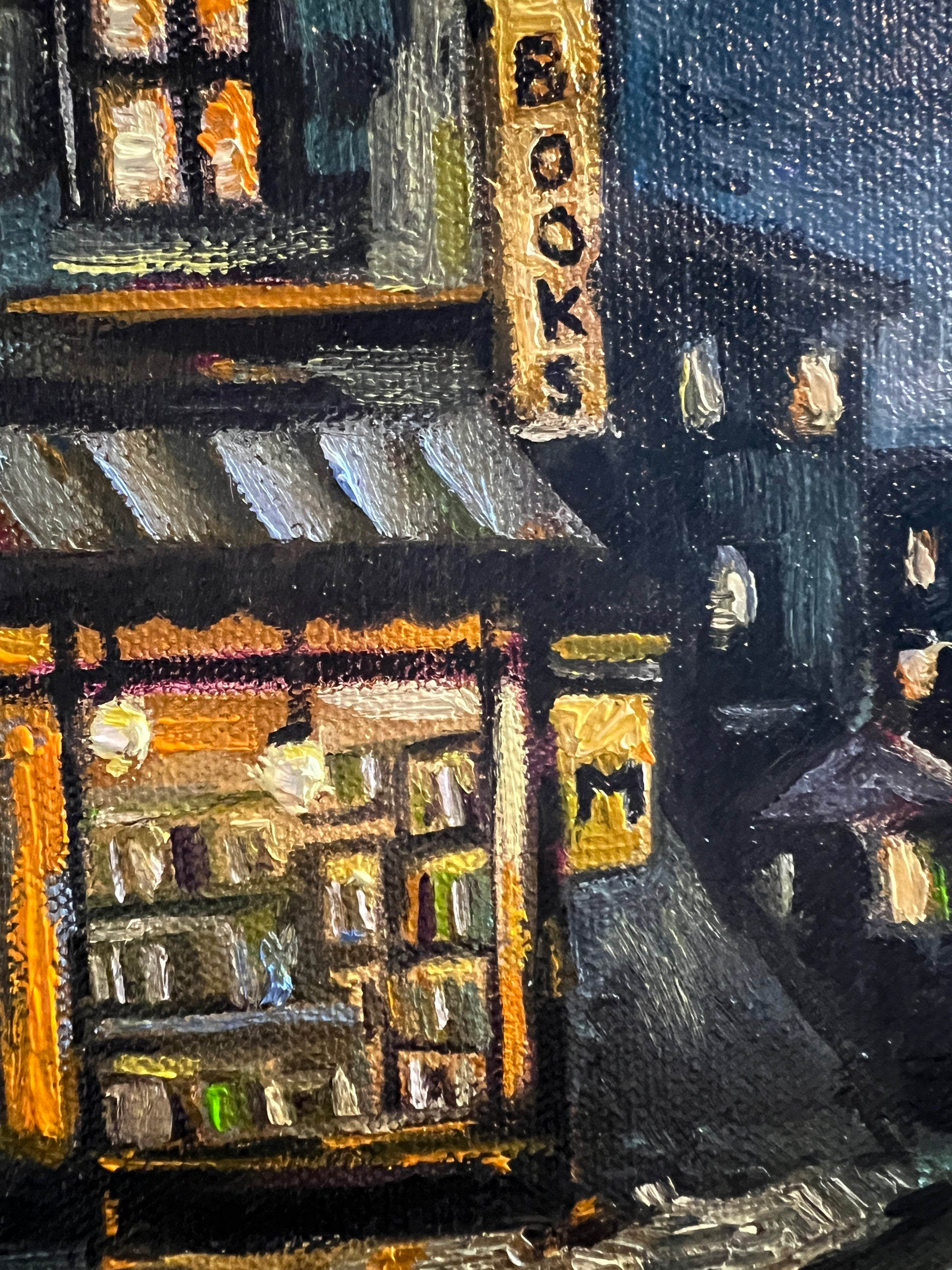 Each brushstroke evokes the magic of stories waiting on the shelves and the timeless comfort of a quiet night in the city.