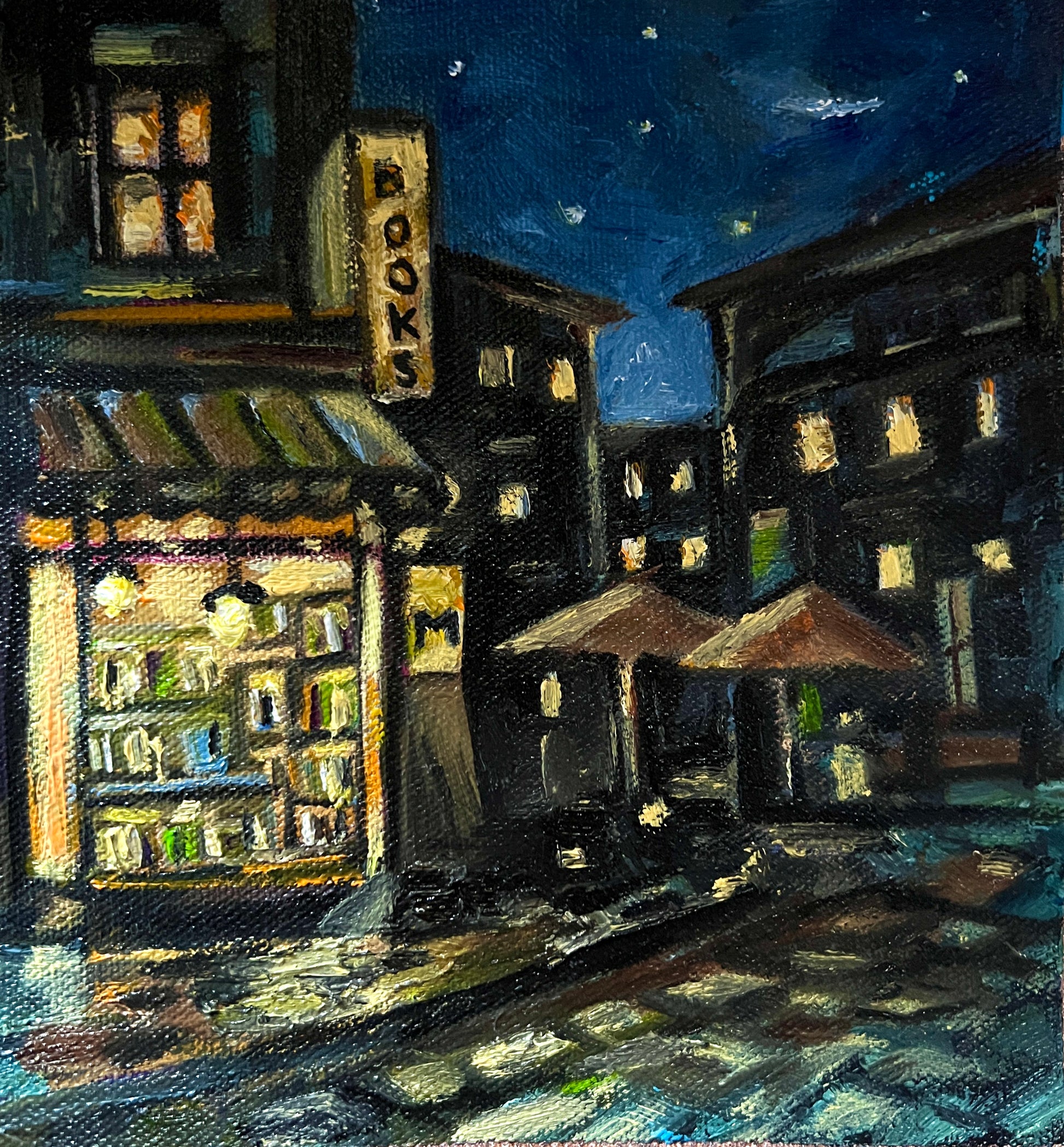 ''Midnight Bookshop Magic'' – Hand-Painted Eco-Friendly Oil Artwork. Step into a world of quiet wonder, a hand-painted oil artwork that captures the serene charm of a corner bookshop glowing under a starlit sky. The streets are still, the air is cool, and the little shop’s warm light spills gently onto the cobblestones — a moment of peace, imagination, and nostalgia.