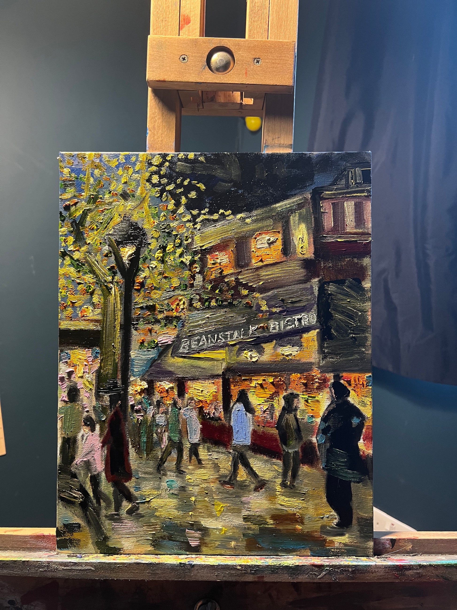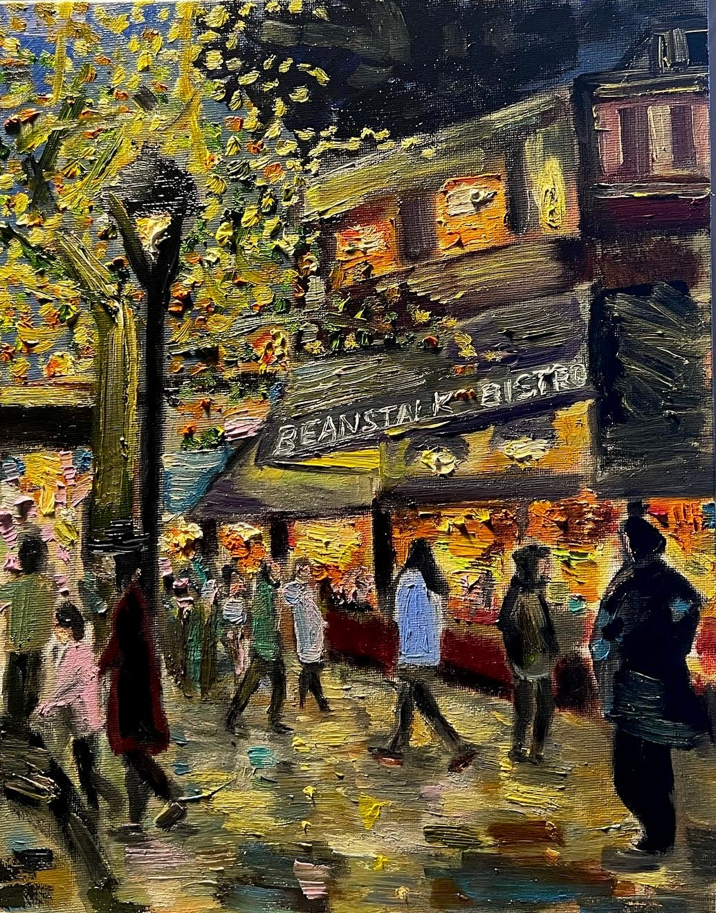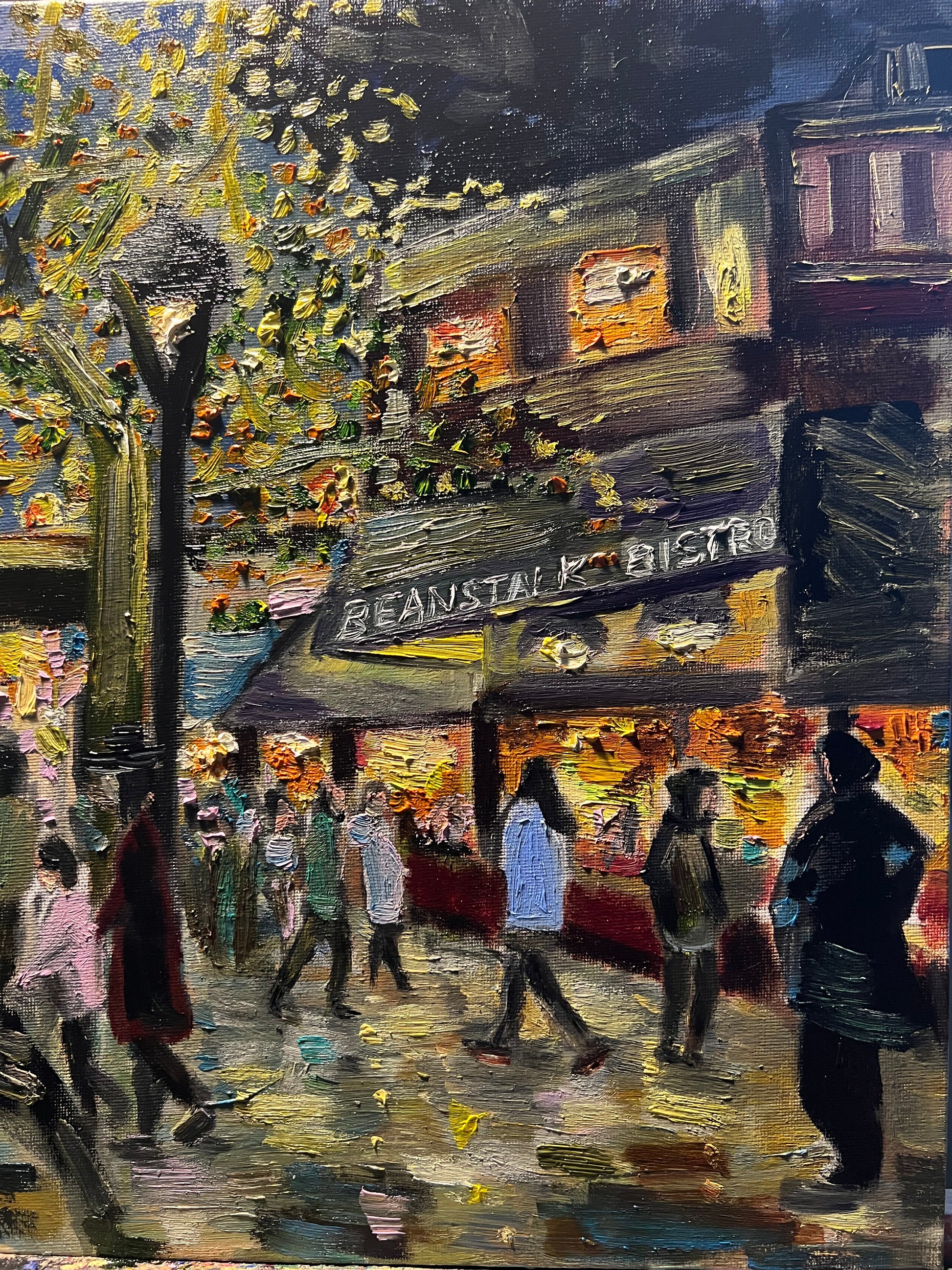 Step into the magical world of this painting, where the bustling atmosphere of the Beanstalk Bistro comes to life. The café's twinkling lights cast a warm and inviting glow, illuminating the entire scene.