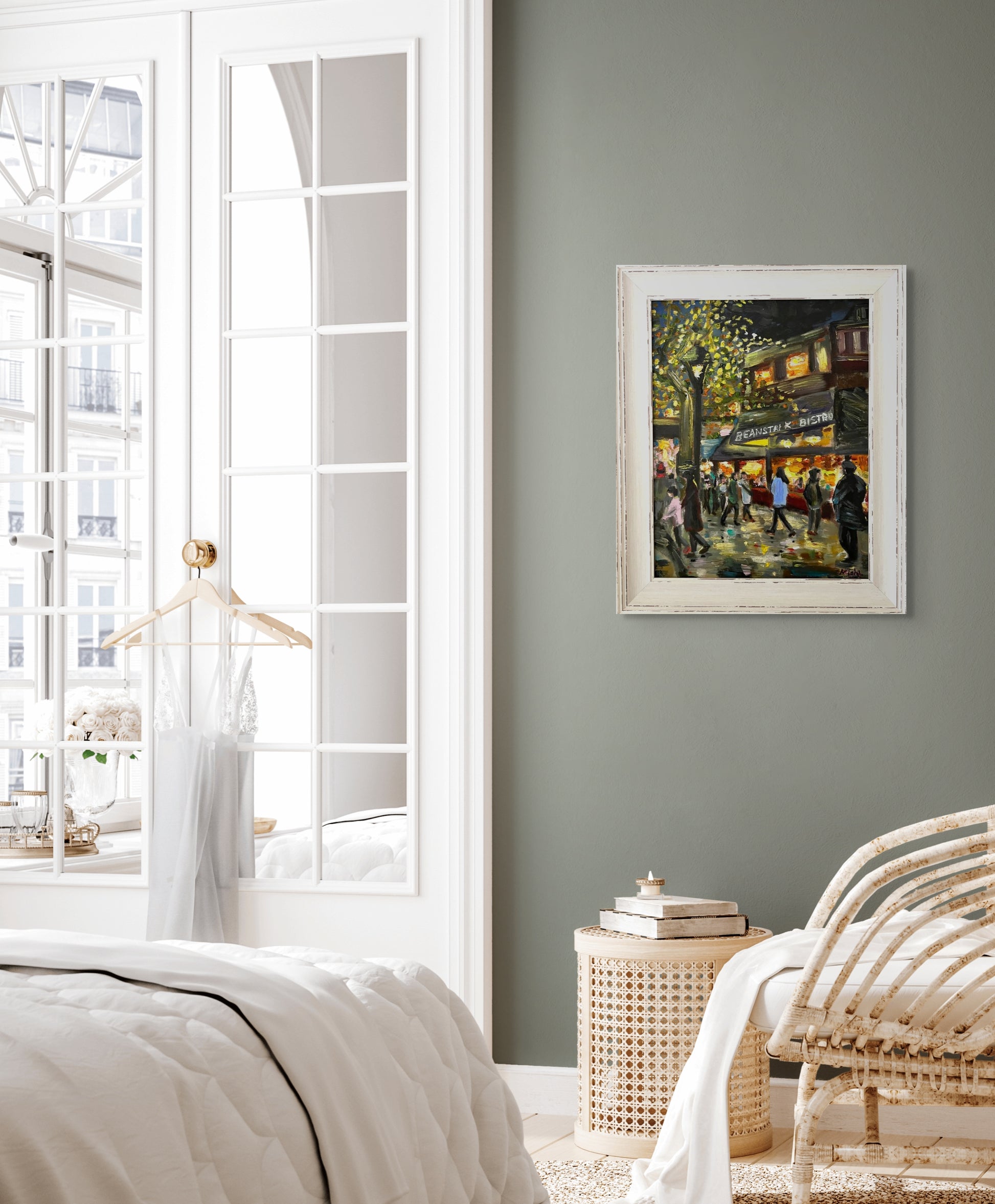 Despite a light rain, people joyfully walk past, undeterred by the weather. Behind a lamppost, the glistening autumn leaves add a touch of charm and seasonal beauty to the setting. This painting captures the essence of a lively, cosy café, blending the vibrancy of human activity with the serene beauty of nature