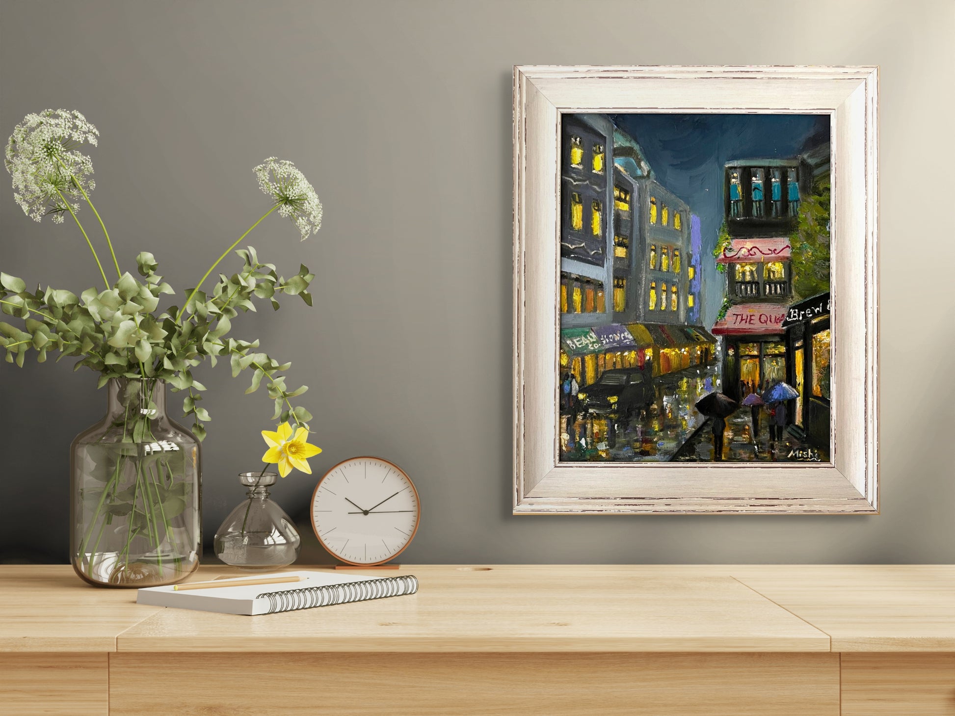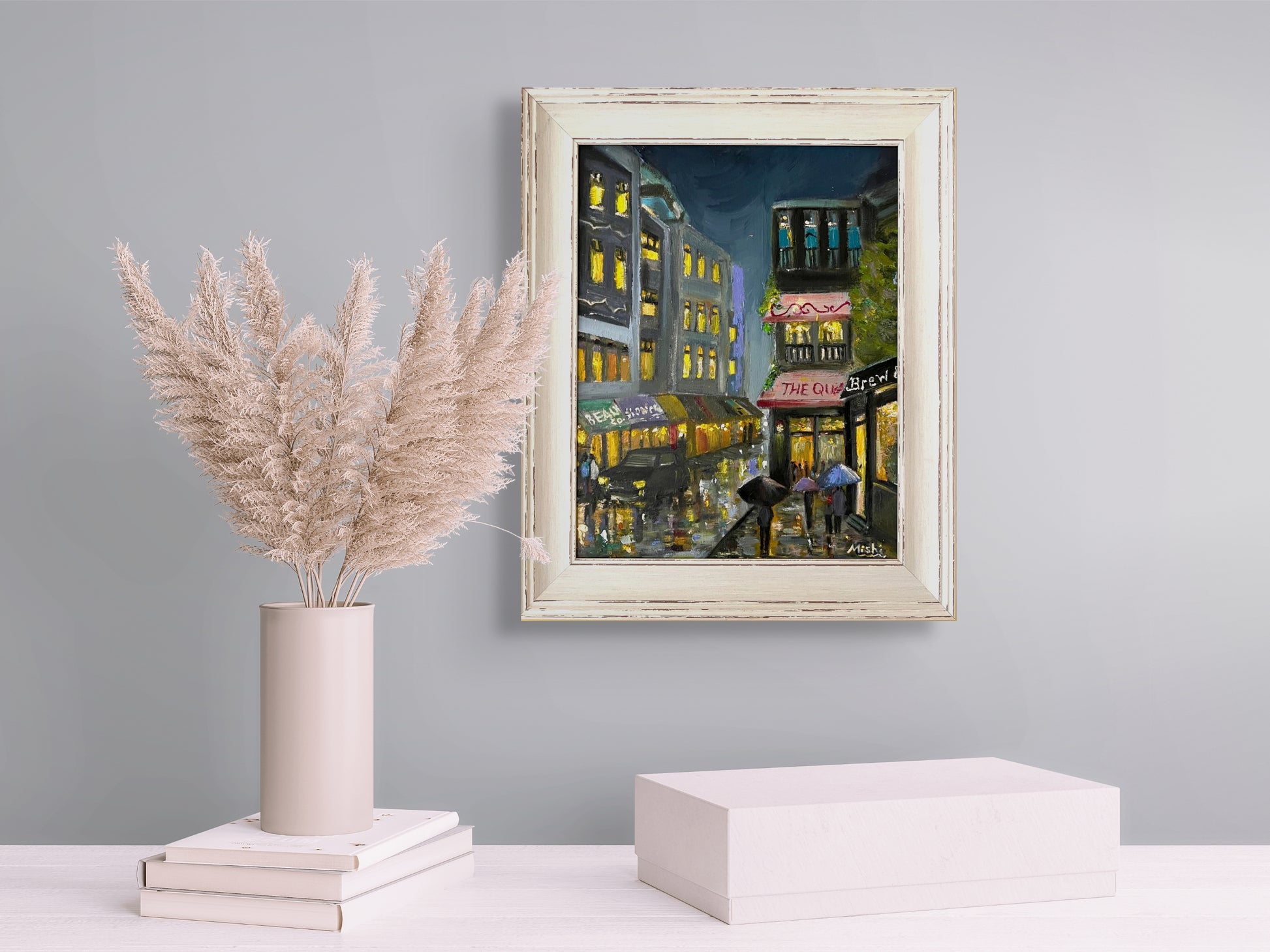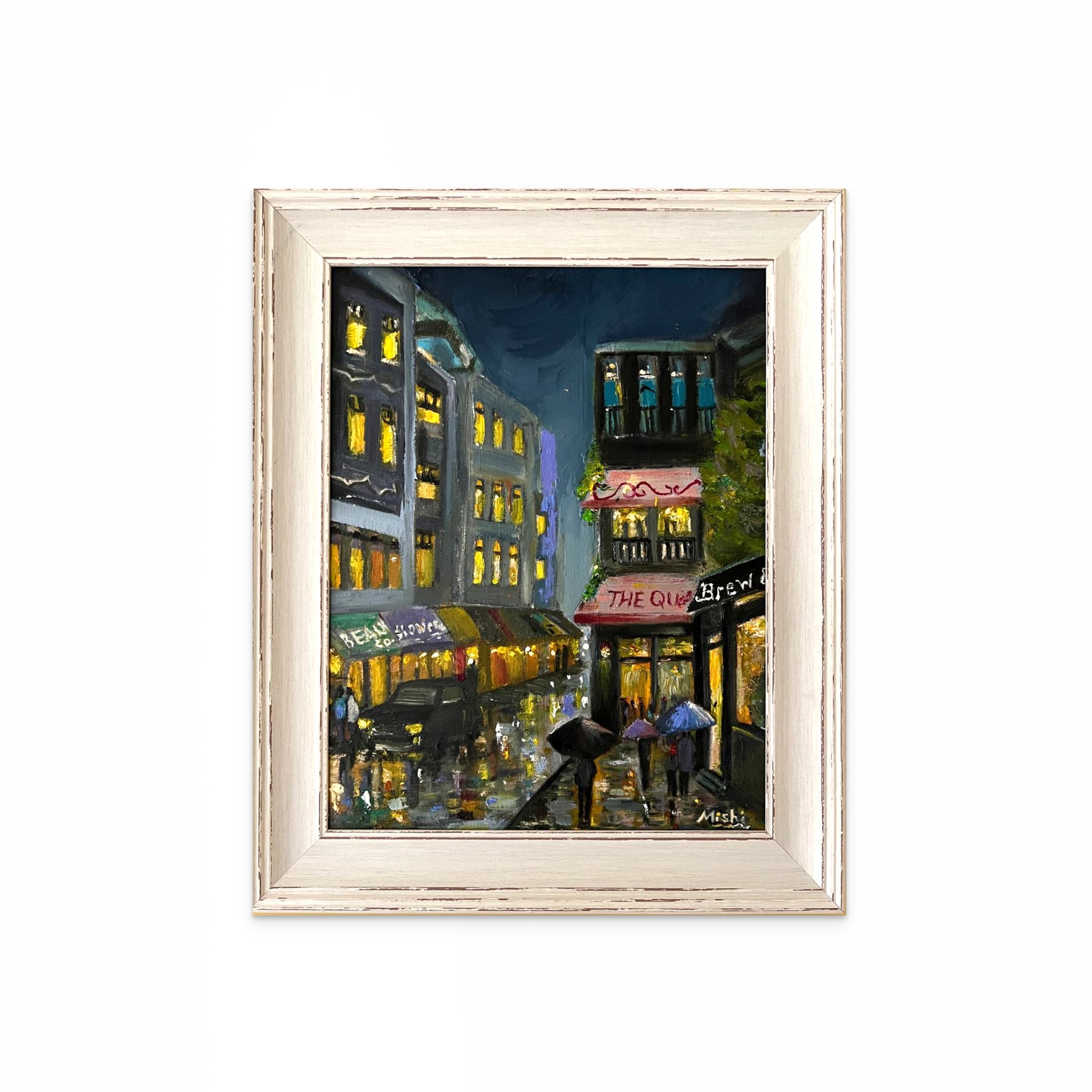 In the quietness of a rainy evening, the city comes alive with golden, glistening light reflections from the rain.
